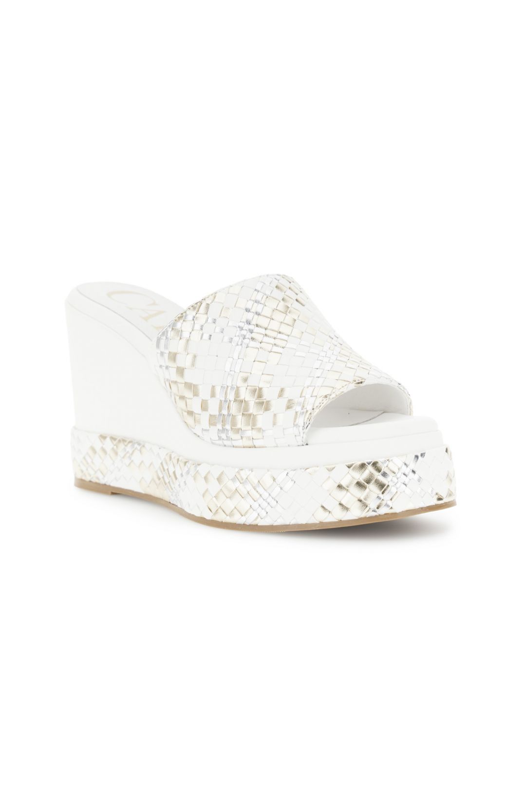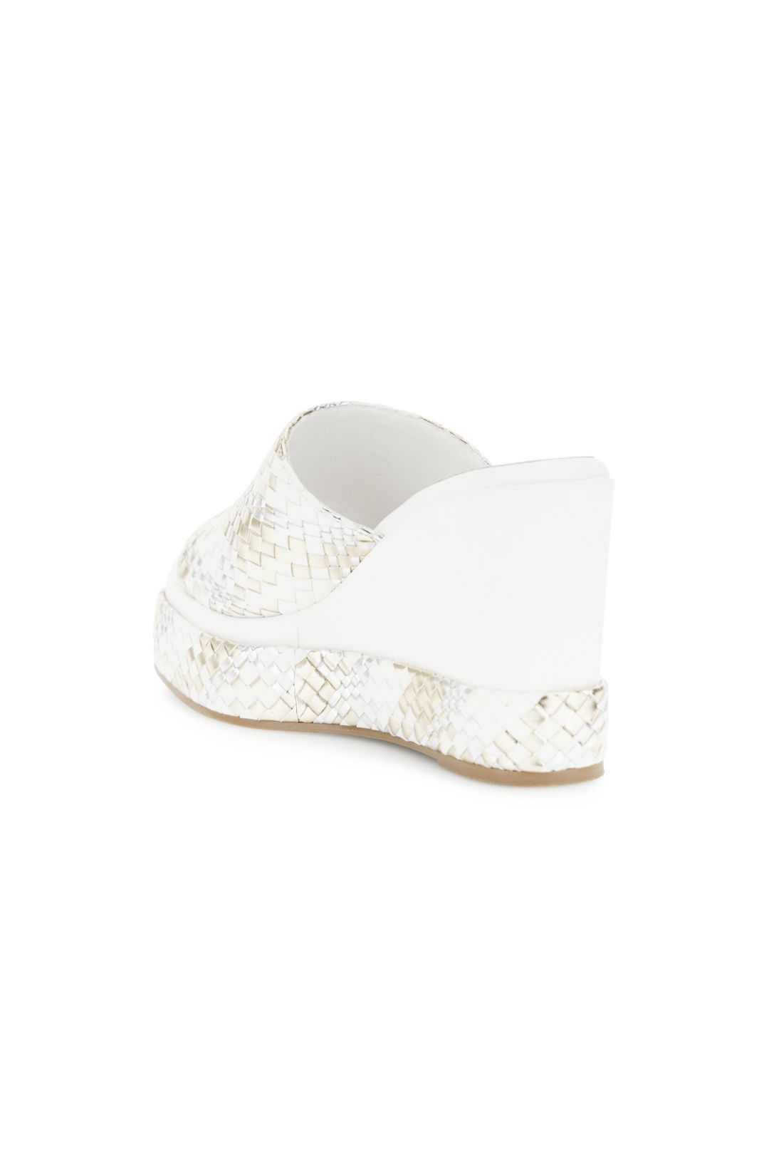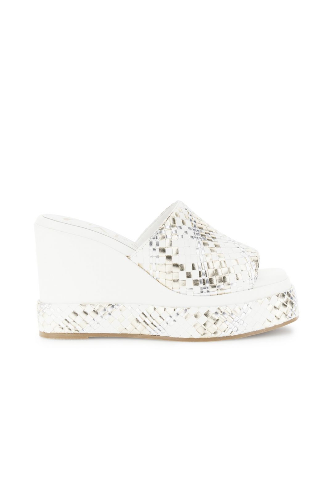 Sandali modello ciabatta con zeppa effetto pelle intrecciata laminata fascia ampia e design estivo. comoda e leggera ideale per look casual-chic. tacco alto 10.2 cm e plateau di 3.3 cm per slanciare senza rinunciare al comfort.