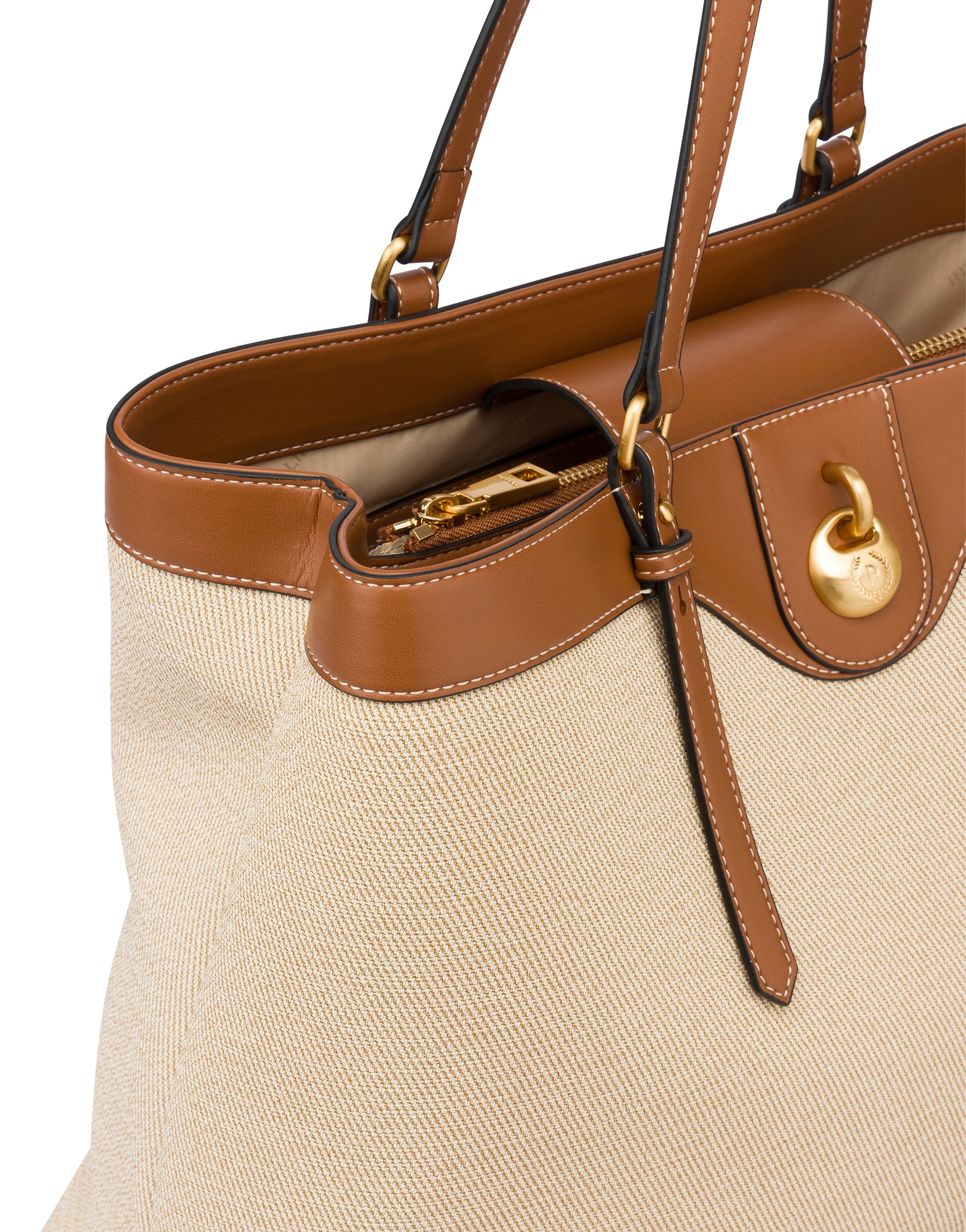 Big Double Handle Drop Bag In Canvas Beige/avorio/cuoio